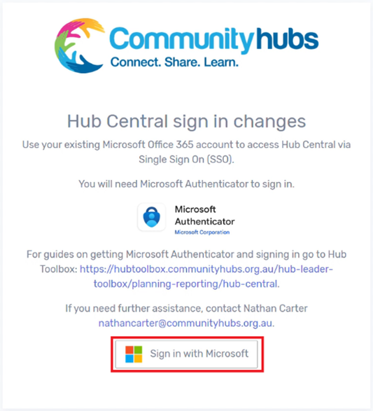 Once you have successfully signed in to Hub Central using Single Sign On (SSO) for the first time, signing in to Hub Central will be done using your Microsoft Office 365 account and occasionally the Microsoft Authenticator app.